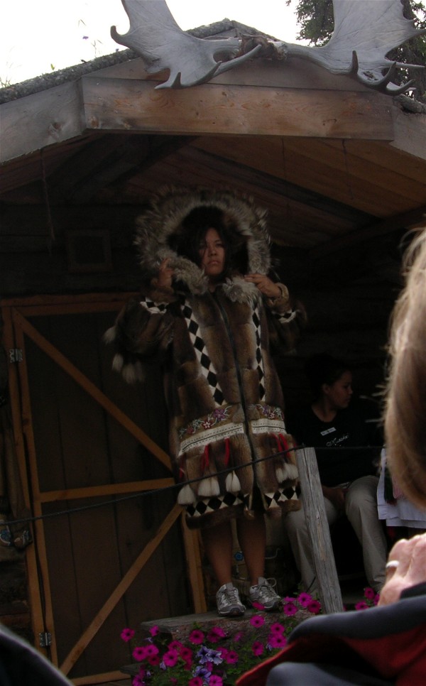 A demonstration of Dixie Alexander's work, some of which is in the Smithsonian in Washington, DC. Dixie was there to answer questions, but the girls from the ship, who are Athabascan, did most of the talking.