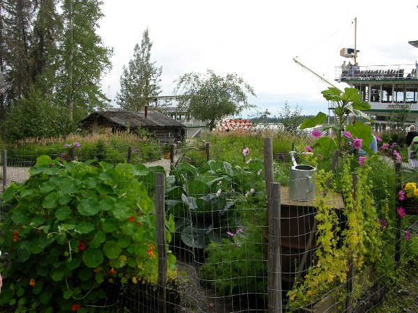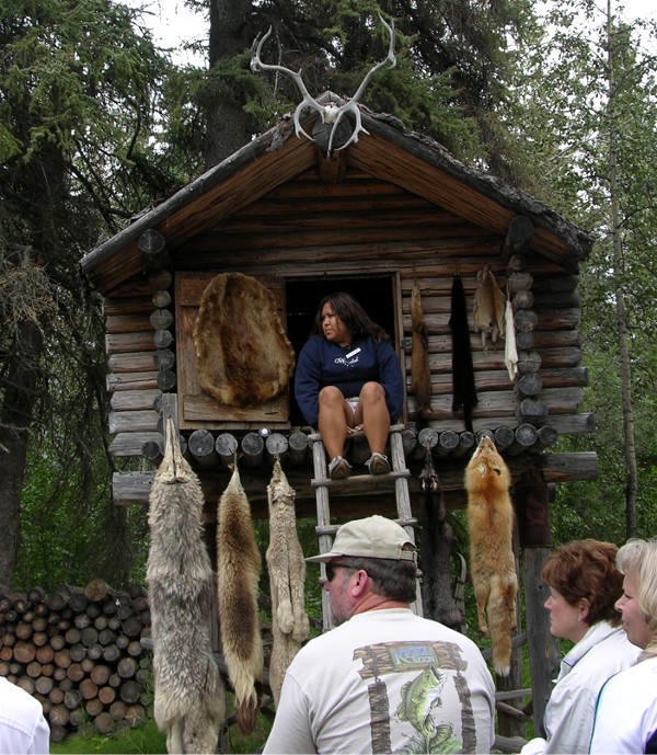 Now we came to their "Chena Indian Village" and got off the ship. The place was to show us how the Athabascans lived. Our ship was broken into large groups and we started by going to Dixie Alexander's cabin to learn about the outfits she makes. Here is the sod roof of the house, it doesn't rain much here so the plants absorb the water and do not rot the roof: