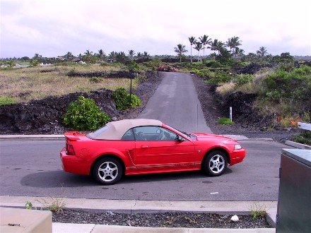 Security was tight heading to Hawaii, we changed planes in Honolulu and the airport was under tight control. We got our bags searched in Honolulu, but that meant we were first on the commuter flight to Kona, which was not assigned seating. When we arrived the rental car company was out of what we asked for and only had a convertible. That was fine except the trunk was too small so we carried our bags in the back seat to the condo. Here is the car and a sunset from the condo: