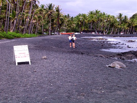 On the way to Hilo we came upon another state park on a black sand beach with sea turtles resting. The park service put "do not disturb" signs out which also told people exactly where the turtles were: