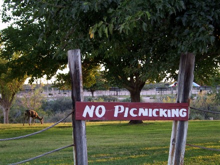 The deer seem to ignore the "No Picnicking" sign: