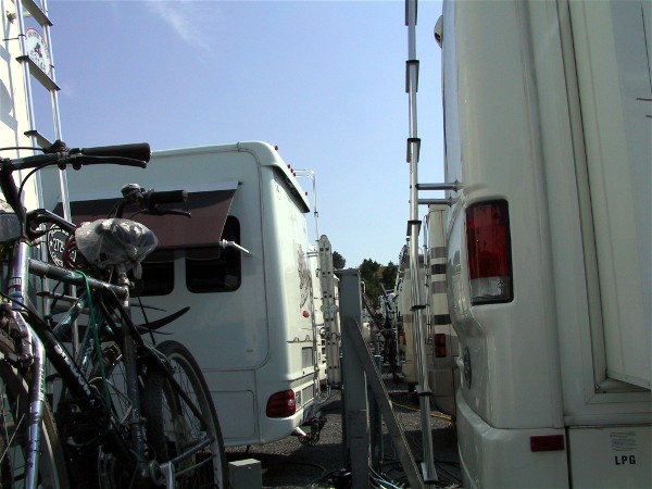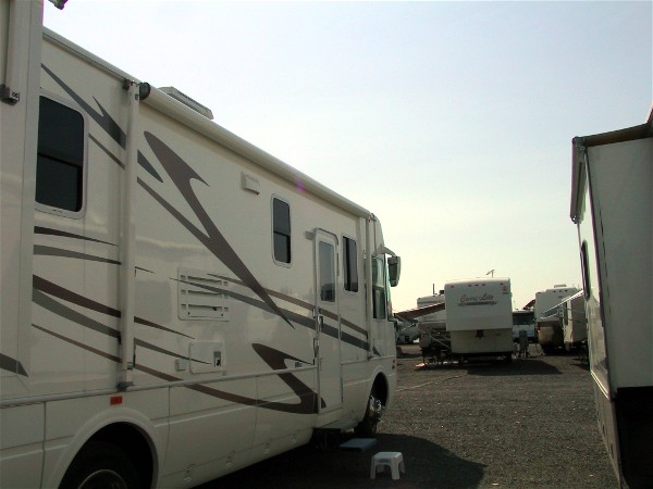 We took a week off work to attend Life On Wheels conference at the University of Idaho in Moscow, ID. It was a very hot day when we went over the Cascade Mountains and we learned that we could not run both roof air conditioners with our generator, it overheated the generator. When we got to the campground in Steptoe, WA after 288 miles it was 111 degrees. The next day we drove the motorhome to the conference and it was still quite hot, the people doing the parking were not comfortable. Here is how we were parked: