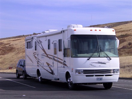 On I-5 heading south to Portland we noticed that the motorhome no longer felt like it was being dragged into a semi truck when we were passed, we just felt a looseness in the steering. Once the front sway bar was installed the looseness went away. All the suspension changes had made a real difference and they made the motorhome ride much nicer. The rear end was also raised a few inches since the changes made the chassis sit up better in the back. It is hard to see in pictures, but the backend is a bit higher than the pictures from when we got the tow-bar installed in February. These pictures were from Eastern Oregon. In the second picture you can see the RV Underskirt Bill installed to prevent rock damage to the car.