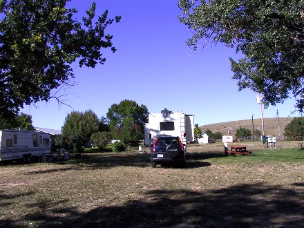 The weather had cooled a lot and we were in wind when we stopped for lunch at Fort Bridger, WY. We looked back and realized storms were coming so we made an attempt to outrun them and gave up about Rawlins where we stopped for the night to camp. Just as Bill was finishing the outside setup the rain hit, we didn't move until morning. We checked the weather forecast and it was not going to get much better for a couple days. Rawlins didn't have much so we moved to Cheyenne the next day and stayed for two nights. We were able to do some shopping and make phone calls from Cheyenne, our phone was going to roaming when we got to Nebraska and Kansas since we had a west coast plan. (We changed our cell phone to national calling in the spring of 2003).