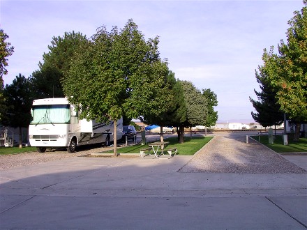 The next day, the 14th, we drove over the passes in Eastern Oregon in 100 degree heat and the motorhome handled it fine. We landed at a campground just inside Idaho, in Fruitland with a huge campsite: