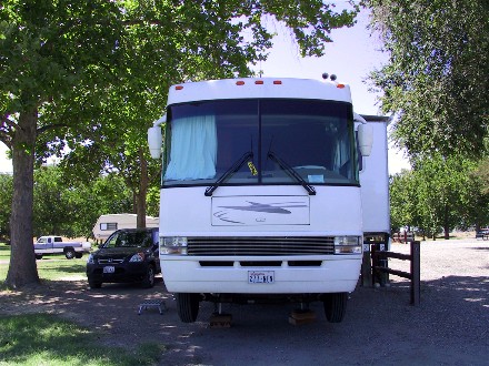 We used to live in Richland, WA, so Pasco was familiar territory and we had planned on visiting on our way east. We checked in for two days at Sandy Heights RV Park after 169 miles on July 19th. Russ Dean could not handle us till the 21st so we visited friends in the area. On the 21st we dropped the motorhome off and kept busy with Evita all day. The problem turned out to be a knock sensor and they ordered one so we had to come back on the 22nd when they could install it. We decided to try staying at Columbia Park, a public campground, for the night. We called up Lake Pleasant RV Resort and moved our reservation out. Here is our campsite at Columbia Park: