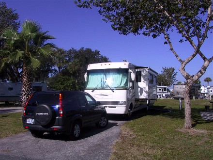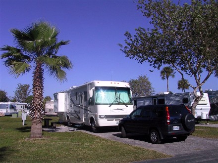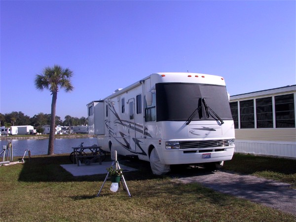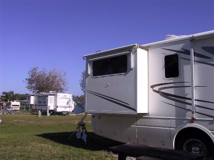 Bill got to the campground and was able to get it parked and setup alone with a few journeys outside to make sure he wasn't going to hit something . Here is the campsite at Encore Sarasota North:
