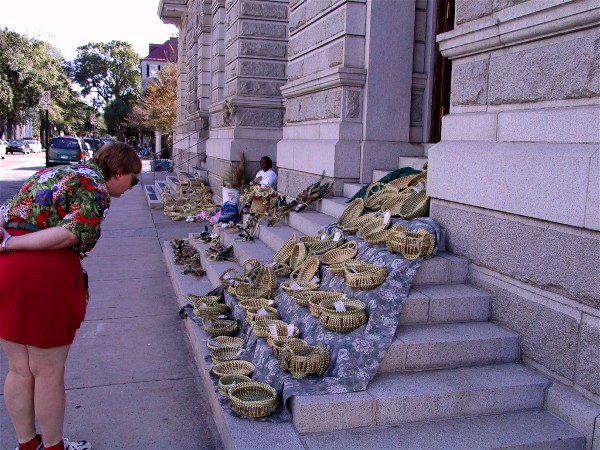Diane looking at the traditional baskets from the area: