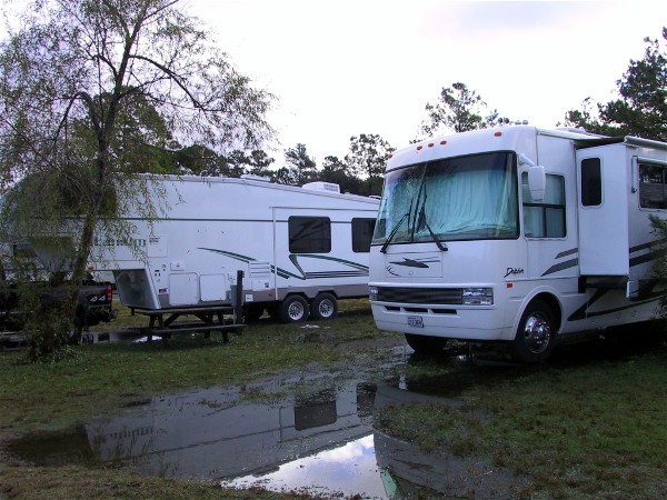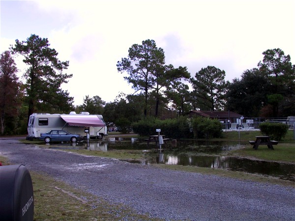 It started to rain, it rained very hard, and for many hours. In the morning we saw ducks swimming out from under the motorhome, there was that much water. When we came out our neighbor to the passenger side had to tell us about the ducks swimming under the motorhome. Here is how it looked after it soaked in a bit: