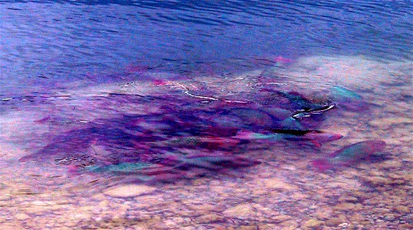 In one place we saw fish milling around and took some pictures. These pictures have the contrast cranked up to make the fish visible, so they are a bit false colored: