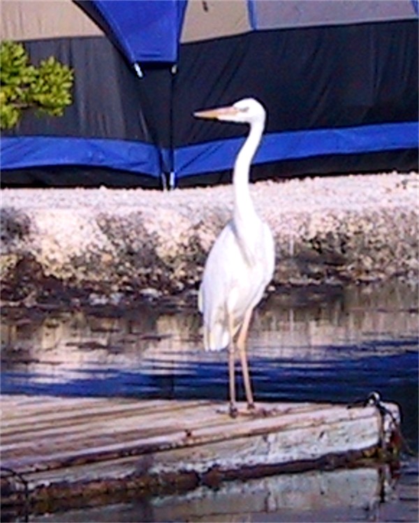 Here is a close up of the bird (sorry it's not in sharp focus), it's a Great White Heron, which is a white version of the Great Blue Heron. We know it is a Great White Heron and not a Great Egret since it has yellow legs and a large head, while the Great Egret has black legs and a smaller head. Great White Herons are only found in the Florida Keys.