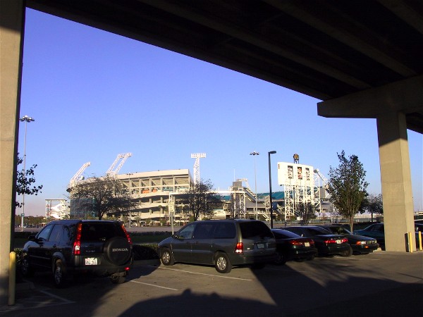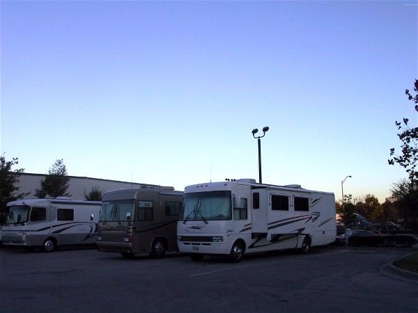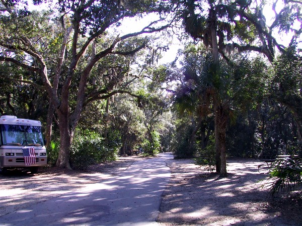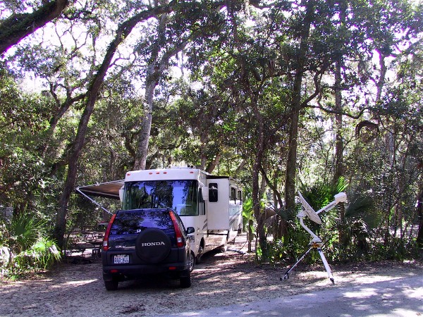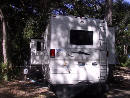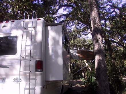 November 4th we drove 171 miles to Hanna Park in Jacksonville, FL. We got slowed by traffic on I-95 and our friends Carolle and Ken, who we met at Camp National RV in December 2002 and again March 2003 were worried about us and called. We met them at a Wal-Mart parking lot in Jacksonville and Carolle rode in the motorhome with Diane driving while Bill rode with Ken to Hanna Park where we had a reservation, first day paid by Ken. Here is our campsite, it was a tight fit for the awning: