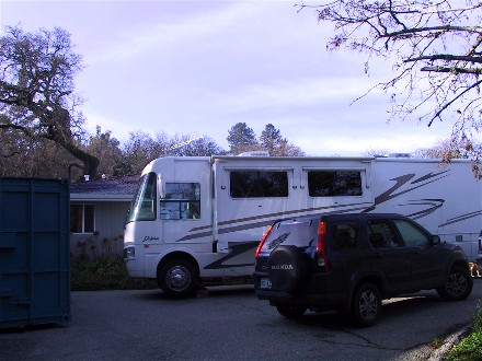 Our mail arrived on January 2nd, so we headed north from Barbara and Roger's house on the 3rd. Here is a picture of how we were camped in front of their house, showing the construction dumpster: