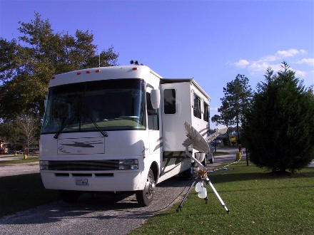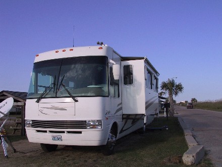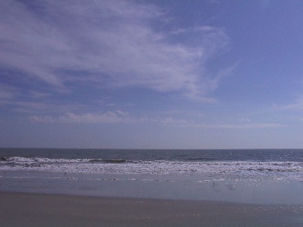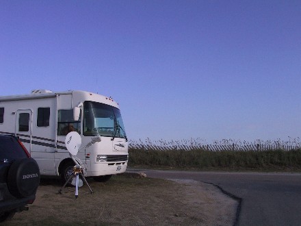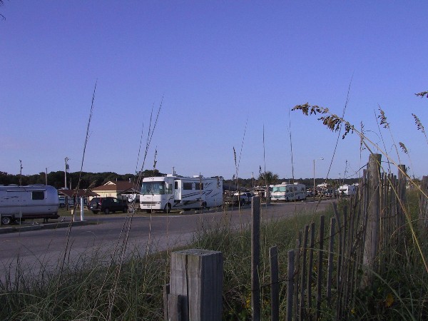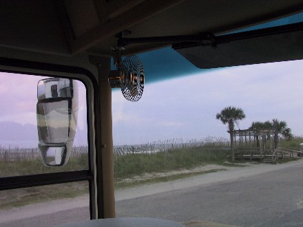October 23rd we drove 101 miles to Pirateland Campground in Myrtle Beach, SC. This is a huge campground with almost 1000 campsites, but there are two larger ones in town. We paid $31/night plus tax for an ocean front campsite, the standard sites were $30/night at this time of year. Four extra dollars for four nights and being on the ocean seemed worth it. We could see the ocean from the windshield: