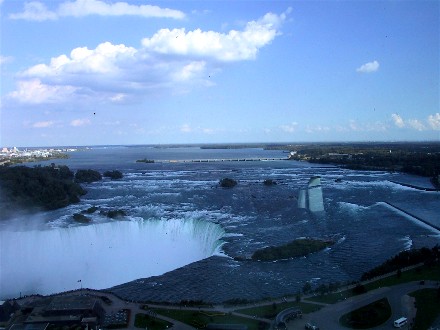 We went up to the top of a hotel tower for a view and took a couple pictures before we found out we had to come back later due to a wedding. You can just see one of the Maid in a Mist boats going up to the falls: