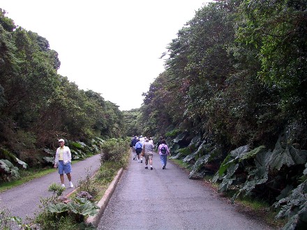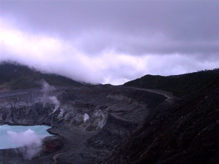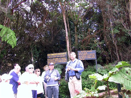 We booked an all day bus tour to a volcano and then some other attractions. Our guide spoke English like an American. It turned out he grew up in New Mexico with a Costa Rican father and American mother. He chose to live in Costa Rica for the benefits, but traveled to the U.S. a lot. We got the impression he had dual citizenship. It was a long ride to the volcano. Here is our guide saying to take the trail fast before the volcano clouds in and another picture showing the trail: