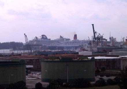 The 25th was cruise day and we looked out of the hotel and there was the Celebrity Summit ("X" on stack) and in front of it was the Cunard Queen Elizabeth II: