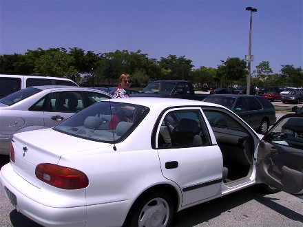 We wanted to go to Sawgrass Mills Outlet Mall, a huge place, since we needed a collapsible suitcase. A cab/limo costs more than a rental car, so we got a rental car. They wanted to charge us extra for two drivers so Diane drove: