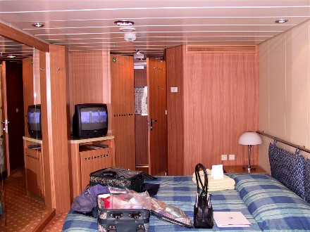 We could not board until afternoon so we had breakfast, leisurely packed and put our suitcases with the front desk while we checked out. For lunch we went next door to a Thai restaurant that was decent, but not worth reporting on. Then we came back to the hotel for our shuttle to the cruise ship. There had been a problem, two different employees had booked the shuttle and it was full. The hotel called us a cab and paid the way including the tip. We boarded the ship, which the cruise lines call "embarkation" and here is our cabin as we unpacked, it was about 1:45PM: