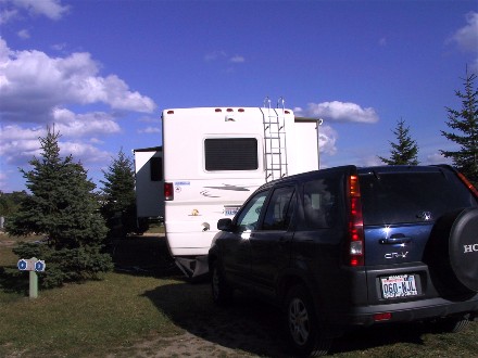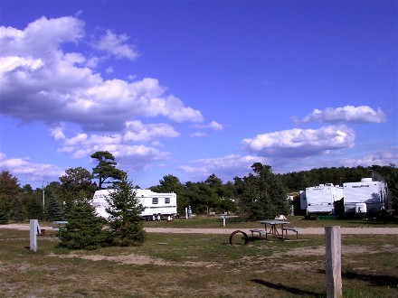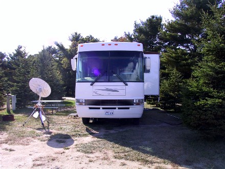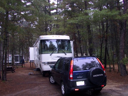 October 5th we skirted around Boston metro and ended up at Sandy Pond Campground south of Plymouth, MA after 123 miles. The Trailer Life Directory made it sound like it was going to be a tight fit in their campsites, but did not include the new section where we had a big spot and it was clear for the satellite dish. The office said Trailer Life wanted them to take out a full page advertisement before they would update their listing. Here is our spot: