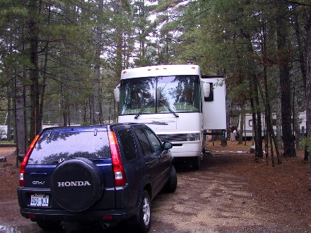 We were here to meet up with old friends, Kathleen and Tony, they lived close by and this was the closest campground that allowed pets. It was expensive for what we got, but that is what you do for friends. Tony told us the roads going into their house had low overhanging branches, so we would not be able to bring our motorhome there. It started raining and we took the notebook computer with GPS to find their place and saw what Tony meant about the overhangs. We had a good visit.