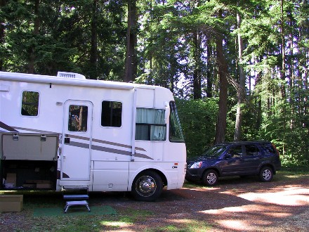 June 8th we had the motorhome packed and caravanned the motorhome towing the CRV and Bill driving the Subaru to Poulsbo and after about an hour working down the driveway had the motorhome parked at Nancie's: