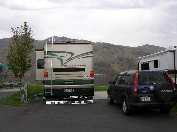 We broke camp and drove mostly back roads to Ellensburg, WA and E&J Resort. The trip included a bridge by Lyons Ferry State Park that we were glad no vehicles were coming the other way on. The total distance was 199 miles. Here is our campsite: