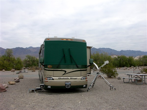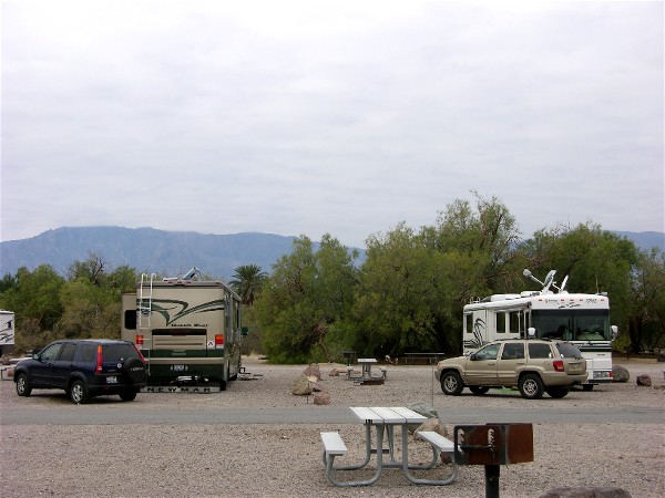 We had been keeping track of Dave and Barb through email since we last saw them in May in Las Vegas. We were hoping to overlap a couple days at Death Valley National Park and ended up coming in the same day, December 8th. We drove in from Las Vegas via Beatty since the standard route was closed due to flash flood damage. We stopped at the Furnace Creek Visitors Center and could see them already camped at Furnace Creek Campground, just behind the visitors center. We camped next to them after a driving 172 miles, some on very narrow road. Here is our campsite the next morning: