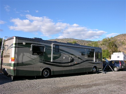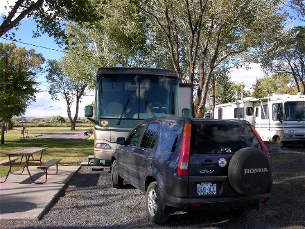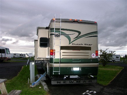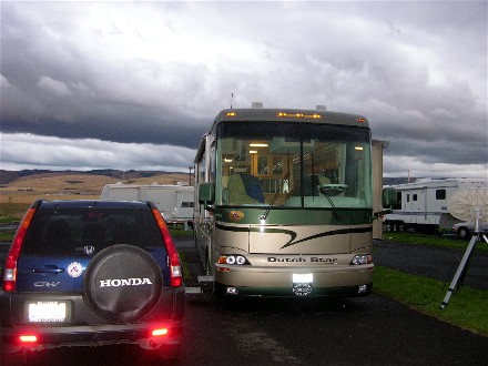 August 24th the rally was over in Baker City so we headed out towards Eugene, OR to get our solar system installed. We stopped for fuel in La Grande and Bill called up to make sure our appointment was still on. He found out that because of the weather they would like to delay a week. Therefore we found that we had a week to play and no reason to drive far. We ended up going only 91 miles to the Wildhorse Casino just east of Pendleton, OR for the night. Here is our campsite showing the weather was not the greatest: