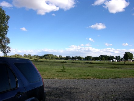 The next morning we decided to explore US395 and headed south. Now the weather was fairly good. Diane's parents once drove their motorhome from Eastern Washington to Southern California in two days one summer so we expected it to be a good road. It was a good road, but it had many passes and curvy areas. After 202 miles we stopped at Burns RV Park in Burns, OR. Here is our campsite and farm view: