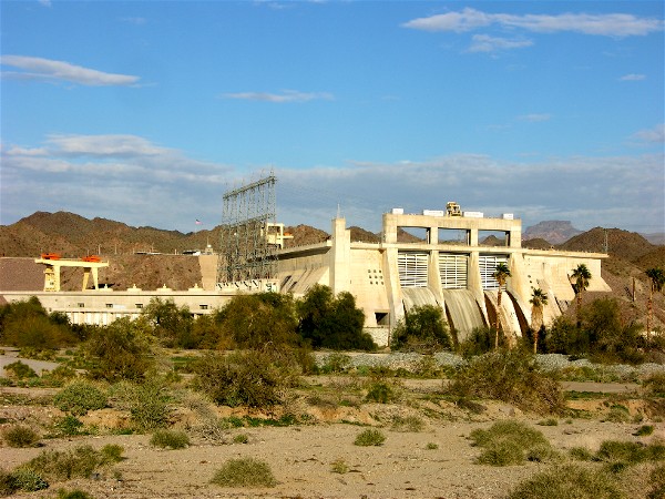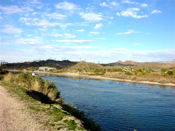 Looking north from the Nevada side at the county park and the power lines from Davis Dam: