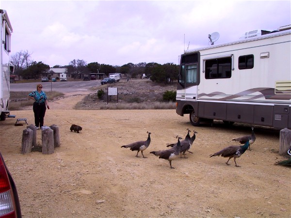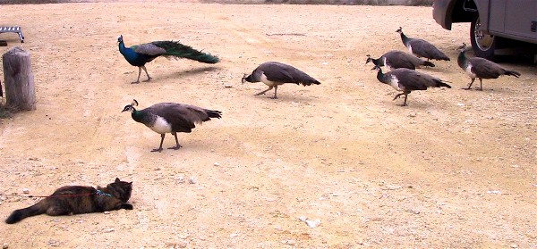 Evita didn't know what to make of the peafowl at the caverns. These birds can take care of themselves, they catch rattlesnakes to eat. Evita had to get close.