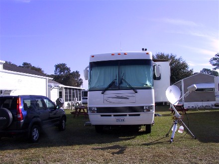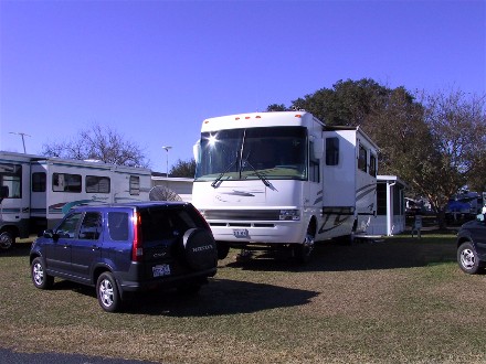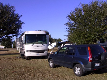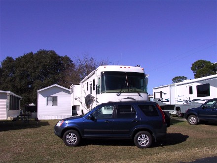 Notice the front wheels of the motorhome are up in the air? The next day the site across the street opened up, it was more level and we asked if we could move. Here we are in the site we moved to where our wheels were touching the ground: