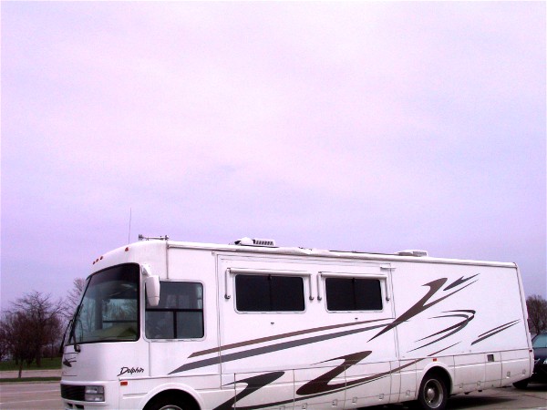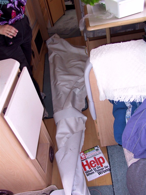 Here is the awning all rolled up and in the motorhome hallway. The magazine headline is very ironic.