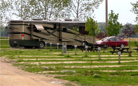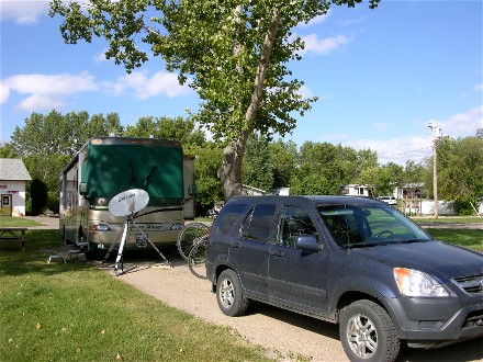 Looking at the map we decided to make our next stop Brandon, MB, and stay two nights to see Riding Mountain National Park. Some of Trans-Canada 1 in Saskatchewan was very rough and the the trucks were still going fast, we picked up another rock chip that ran on the drivers side. Now both windshields, driver and passenger need to be replaced. Our trip was 222 miles and here is our campsite: