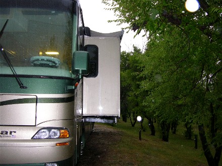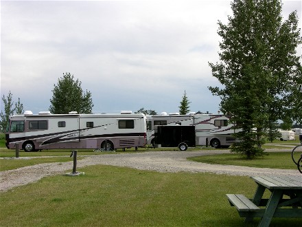 The next day (23rd) we drove east, hoping to get into Saskatchewan a ways. There was not much to see, but as we were nearing the Saskatchewan border we saw a large thunderstorm to the north, we were glad we were missing it. Then the highway turned right towards it and we could tell it was going to hit us. We checked the campground guide and there was a campground at Maple Creek, just inside of Saskatchewan, so we pulled off and checked in. Diane told the office a large thunderstorm was coming, so they came out and agreed. We just had put the leveling jacks down when Bill looked up and told Diane to quit extending the slideouts, the thunderstorm was upon us. Diane retracted the slideout, Bill came in and the thunderstorm hit. Winds were gusting to at least 70mph and we had a couple hail storms with penny sized hail. Then it rained hard. After about an hour it was over and Bill connected the electricity and we setup for the night. Here is how the place looked: