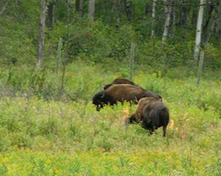 The next day (26th) we drove north to Riding Mountain National Park using our Canadian National Parks pass again. It rained off and on so the camera didn't come out very much. We took one ranger tour, talking about endangered species. The tour was very interesting and we learned a lot about the plants and animals. Bill found out that the white inside an apple seed shows arsenic, so he will quit eating the seeds. After the tour we drove over to where the buffalo roam. Here are a couple of the pictures we did take: