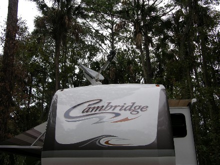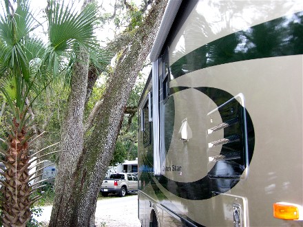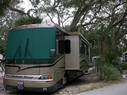 On the 26th we were finally able to move to Hanna Park, a City of Jacksonville campground we stayed at in November 2003. In 2003 we were in site #157, with 50AMPs and it was a nice site for our Dolphin. This time we were in site #158 and it was a bit tight for the Dutch Star. Here are some pictures to show how tight. The first picture shows how close to the road we were on the drivers side and the power box in the back is right by the slide. The second shows the passenger side and the tree.