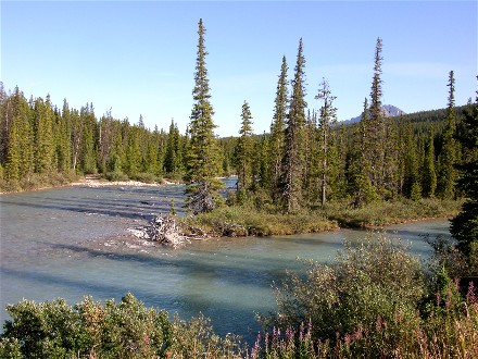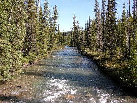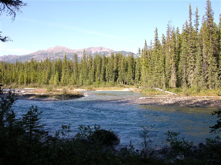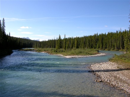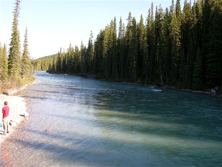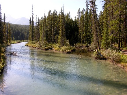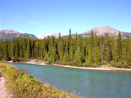 The campground had a trail with bridges across the Bow River so we took the trail from our campsite. We went across the south bridge, up the west side of the river, across the north bridge, which is how vehicles get to the tent area, and back down the east side of the river.