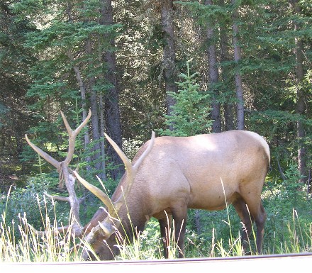 A bit later was another wildlife jam, for a bull elk. These are pictures Bill took from the drivers seat through the passenger window: