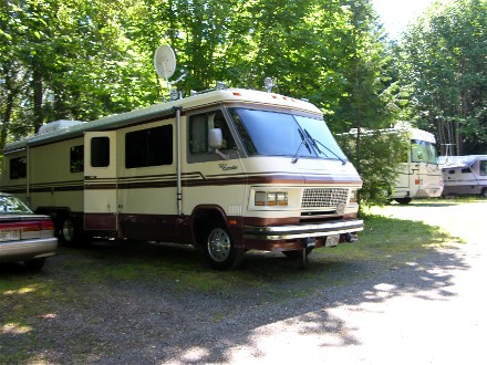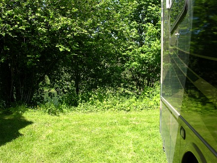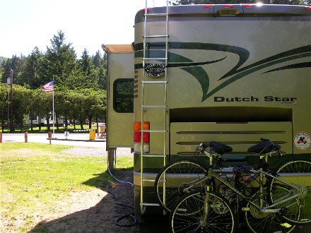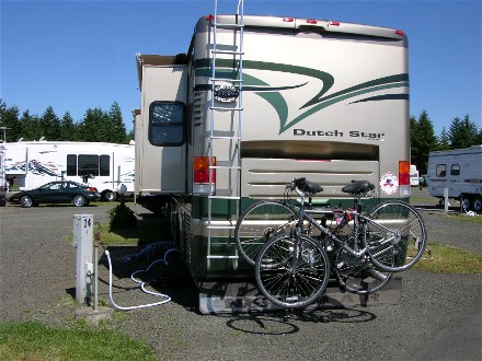 We drove the 55 miles to TTN/LTR Thunderbird (Thousand Trails/Leisure Time Resorts) in Monroe, WA and opted for a 50AMP water and electric site where we could use our satellite dish. Here is our campsite where the rear of the motorhome faced the river: