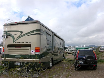 We drove 129 miles from Indio to where the Boomers BOF of Escapees were camped in Quartzsite, AZ. We found a reasonably level location to setup: