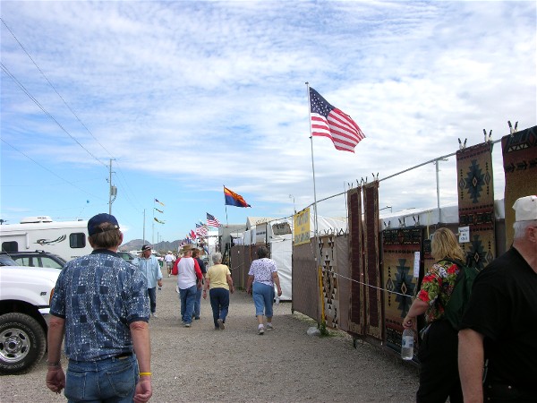 Quartzsite in winter, especially January, is famous in the RV world for all the RVs that come to stay. The area is surrounded by BLM land where you can camp for up to 14 days free or $30 for two weeks with access to a dump and water or $140 for eight months with access to a dump and water. In town are flea markets, restaurants, RV and rock shows. We decided to experience this for ourselves by spending time with both the Boomers BOF of Escapees in a 14 day free area and with Life on Wheels Alumni where we needed to pay.