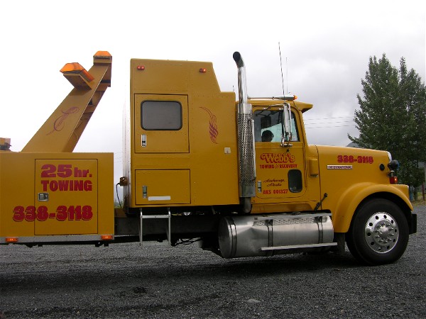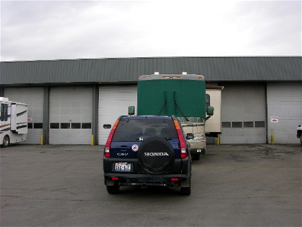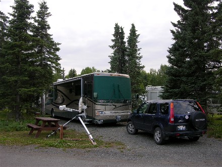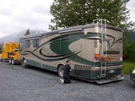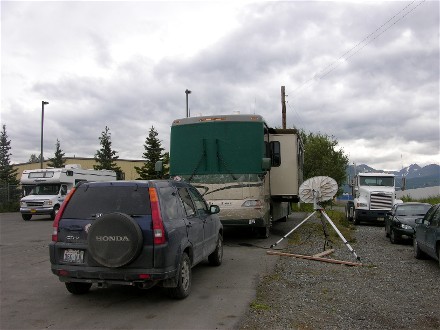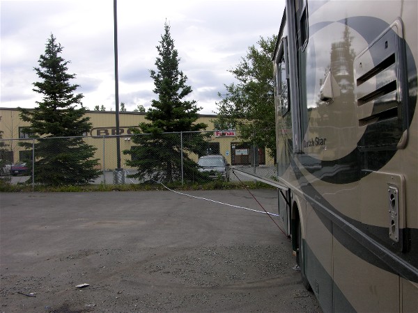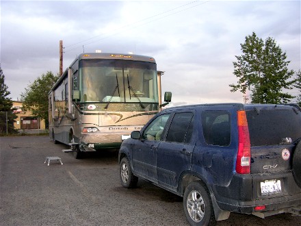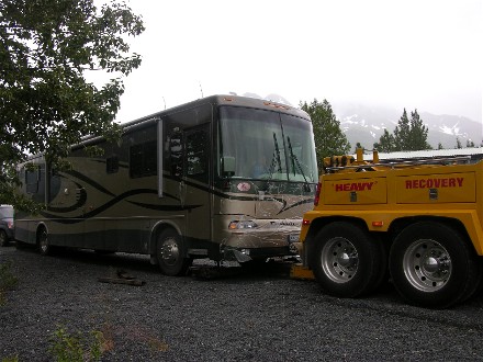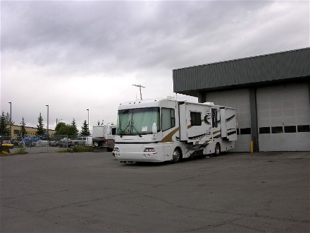 The driver was very conscientious and made sure not to damage anything. He had his two young boys with him, they were all going out to dinner that evening. We followed in the car as he towed the motorhome to Cummins Northwest in Anchorage. He dropped us off about 8:30PM after about 50 miles. His wife came and retrieved the boys, she grew up in Auburn, WA. They went off to dinner. We set up as well as we could and we went to Denny's for a late dinner, we were not looking for anything exciting and knew where Denny's was. Cummins would not have anyone to work on our motorhome until Monday.