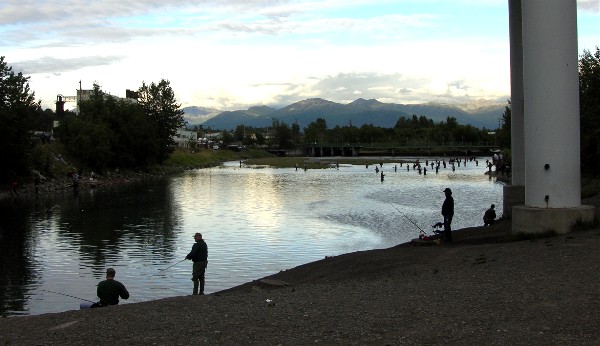We decided to try The Bridge Restaurant on Ship Creek in town to celebrate. Here they are combat fishing Ship Creek in front of the restaurant. The Bridge was about the fanciest place in Anchorage and our dinner was about $60 with tip, which was cheaper than an equivalent meal in Seattle but not as well executed. Since it is actually quite easy to spend $40-50 in Anchorage for so-so food, we can recommend The Bridge but it doesn't compare to a place like Ray's Boathouse in Seattle (more like $100 for two).