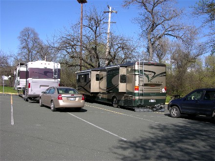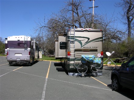 April 14th we drove 165 miles to Clear Lake State Park in Kelseyville, CA. We were too long for the campground and knew to camp in the boat ramp parking lot. There were no hookups. Diane's parents came in about 15 minutes later and camped next to us. We had independently planned to be in Kelseyville at the same time and Diane's sister, Kimberly, who we were here to visit realized we were coming at the same time. Here are our two motorhomes camped in the parking lot: