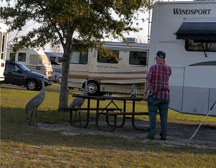 We were going to visit Juniper Springs also, but found out we would need to spend another $8.56 for that and decided to head home. Coming back into the campground we saw these Florida Sandhill Cranes with a camper: