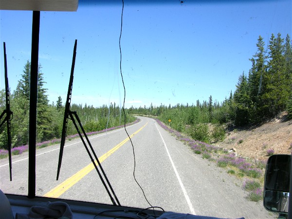 Wildflowers were all over the Klondike Highway, but not always at the places to stop. Here is a typical view through the windshield showing flowers on both sides of the road.