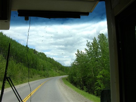 The morning of June 6th we talked to some of the Nutty Buddy's and found out their caravan schedule. They figured White Spot sounded good, one of them loved fish-n-chips and the ones at White Spot are quite good. The campground had a 2.5c/liter discount at the local Shell so we fueled up the motorhome and headed to Dawson Creek, BC. We got bug splattered on the way, here is what it looked like through the windshield (the cord is the GPS for the computer):