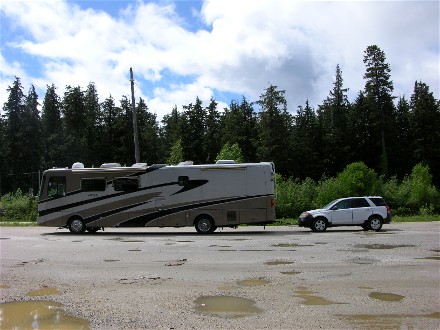 We drove out of the campground in Jasper National Park and headed west on the Yellowhead Highway, CA16. It rained off and on the whole way. This day we saw our first black bear, about 100 miles east of Jasper, AB. It ran up the hill by the side of the highway. About the time we were looking for a place to stop to eat lunch we saw a bunch of RVs parked in the lot of a closed restaurant and four of the RVs were the Nutty Buddy's from Florida: